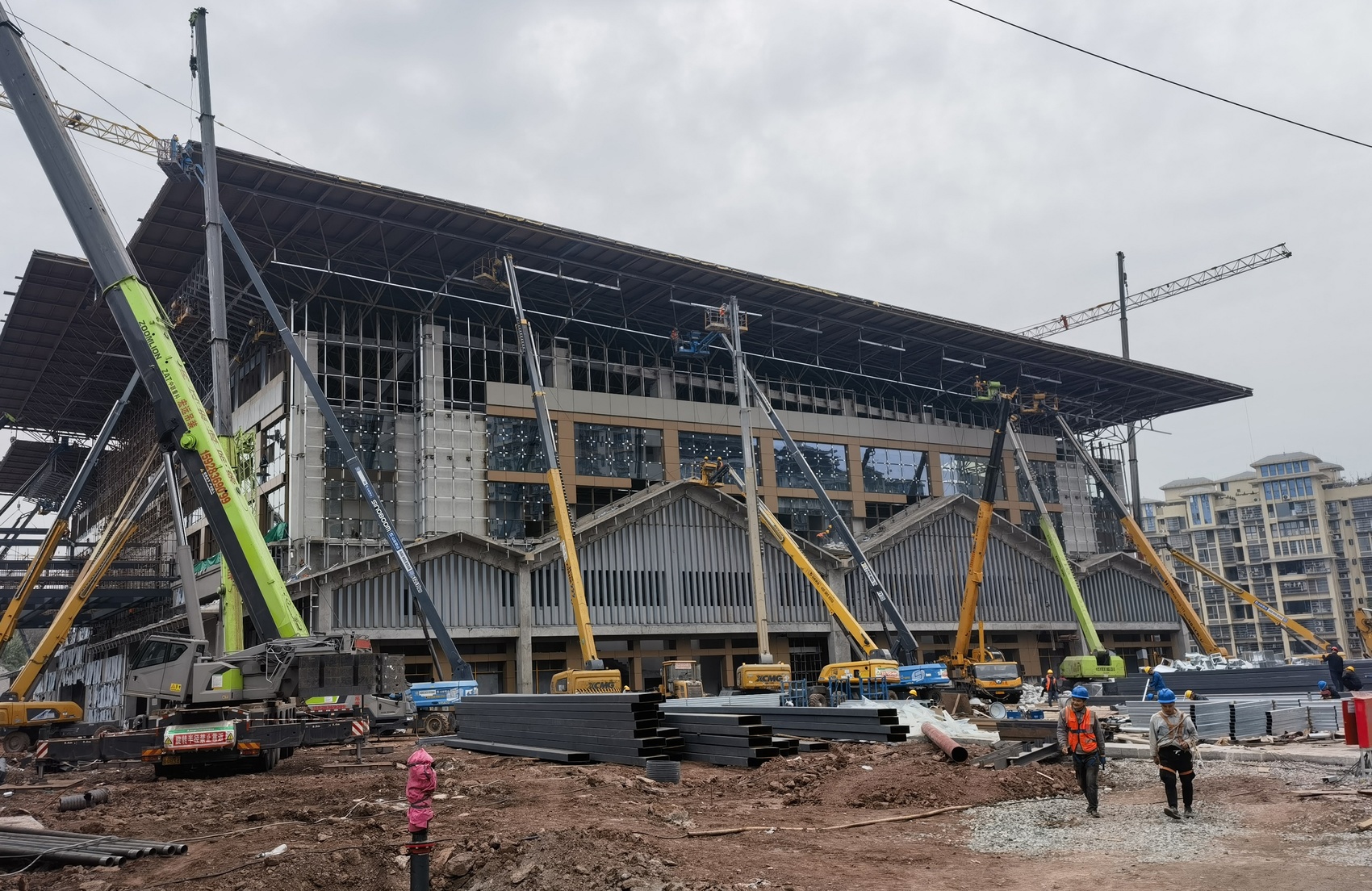 3月14日,在位于资中县重龙镇的资中万金山体育公园项目建设现场,10几台曲臂车伸长了“手臂”,环绕在正在建设中的足球场外围。工人们站在曲臂车上,在离地面20多米的空中,为足球场顶棚安装铝挡板幕墙。