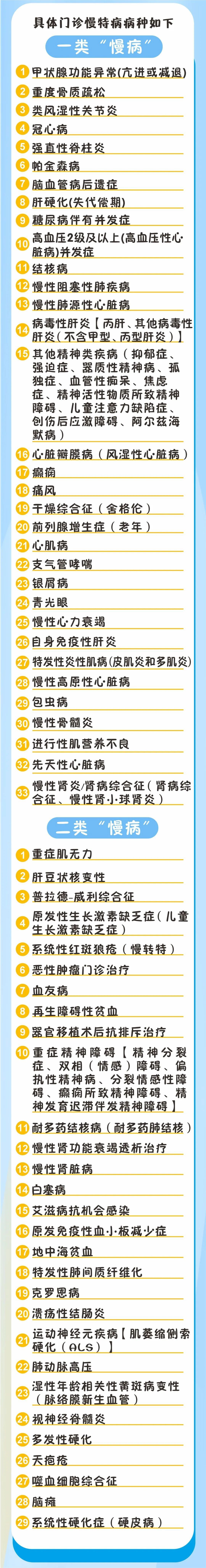 1、慢性病:报销范围由原来的26种,新增至33种,涵盖甲状腺功能异常、重度骨质疏松、类风湿性关节炎、冠心病等病症(见图);