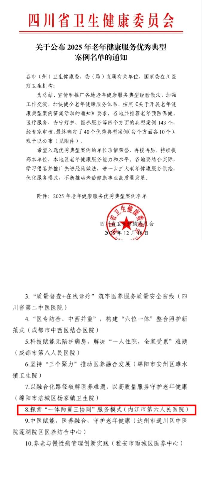 近期,四川省卫生健康委员会公布2025年老年健康服务优秀典型案例名单,内江市第六人民医院报送的《探索“一体两翼三协同”服务模式》从全省143个典型案例中脱颖而出,成功入选医养服务类优秀典型案例,成为全省医养结合领域示范样本,为区域老龄健康事业高质量发展树立了新标杆。