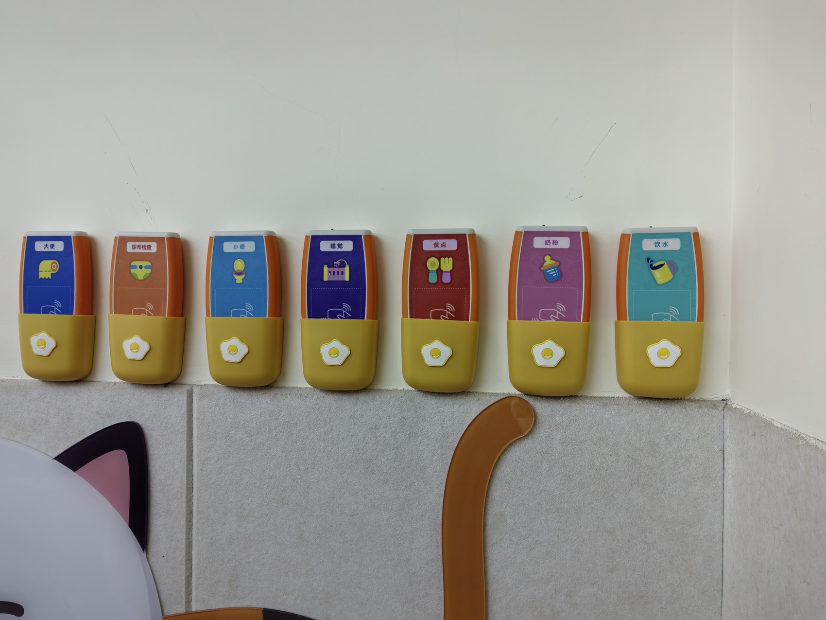 走进乳儿班,几名小朋友正在老师的陪伴下玩游戏。教室门口的墙壁上整齐排列着7个感应模块,分别标注着“饮水”“奶粉”“餐点”“睡觉”“尿布检查”等字样。老师将小朋友们饮水、用餐、睡觉等情况上传智慧托育系统后,家长通过手机客户端便能查看相关信息。