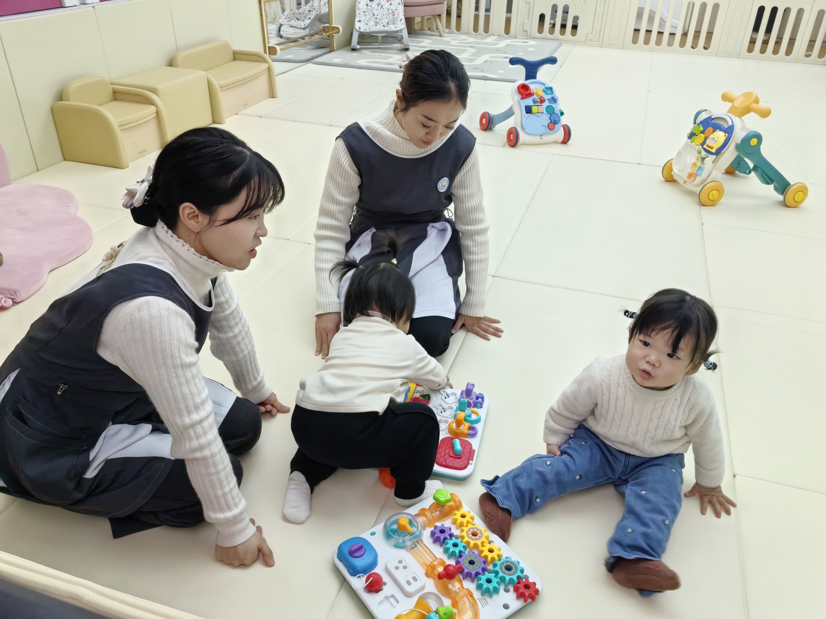 小朋友在老师的陪伴下玩玩具