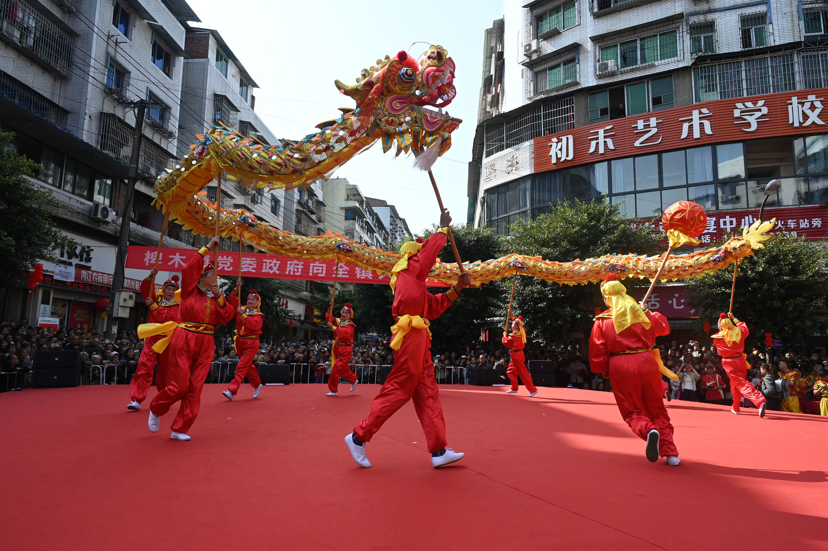 启动仪式结束后,队伍从椑木镇政府大院出发,沿街巡游,引来群众围观拍照。当巡游队伍抵达兴隆街集中表演场地时,现场早已是人山人海。随着《中国龙》的激昂旋律响起,集中展演环节正式拉开大幕。巨龙在场上盘旋飞舞,祥狮登高送福更是将人们拉回了儿时的记忆。