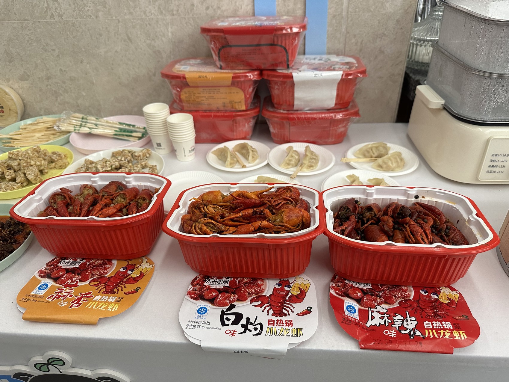 发布会现场展示的自热小龙虾产品(田珊/摄)