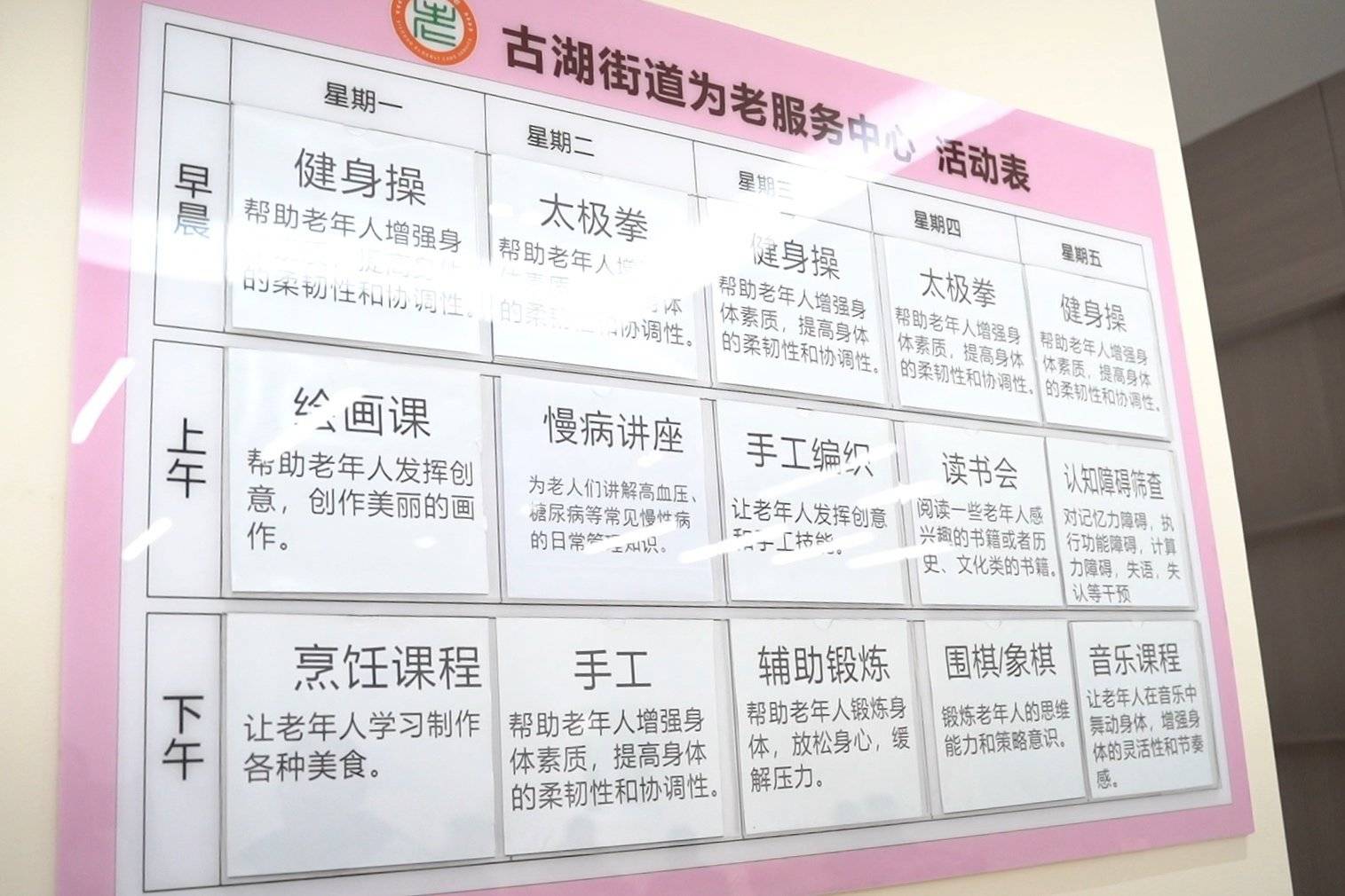 古湖街道社区综合为老服务中心位于环城南路,于2024年初正式投入运营,中心面积1401平方米,不仅提供全托式养老、日间照料,同时也为社区老年人提供休闲娱乐场地,开展文化活动、健康讲座等,让社区老人有处可去,有乐可享。