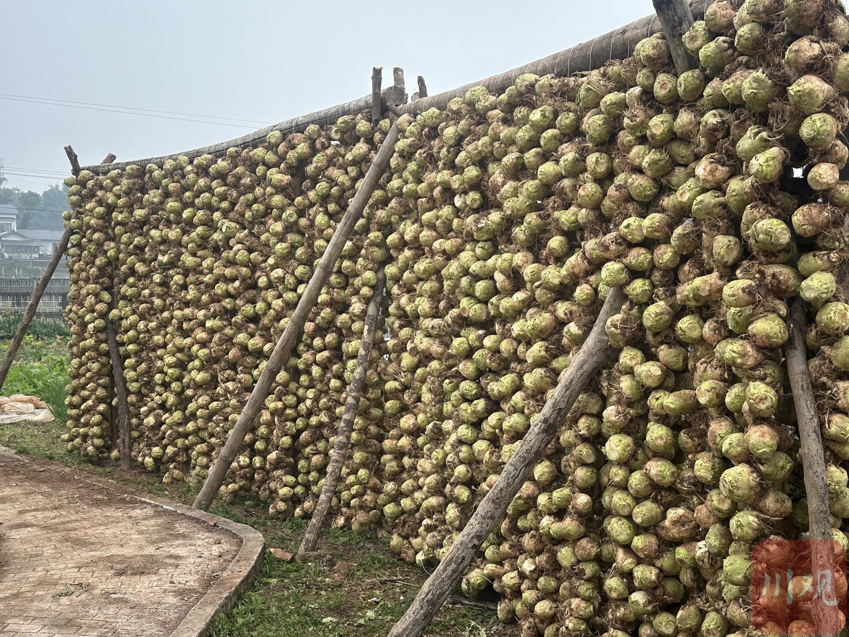 深冬时节,驱车行驶在国道214线贡威路段,往威远县向义镇大冲村方向前行,每过几十米就能望见路边村民院坝里晾晒着的大头菜。