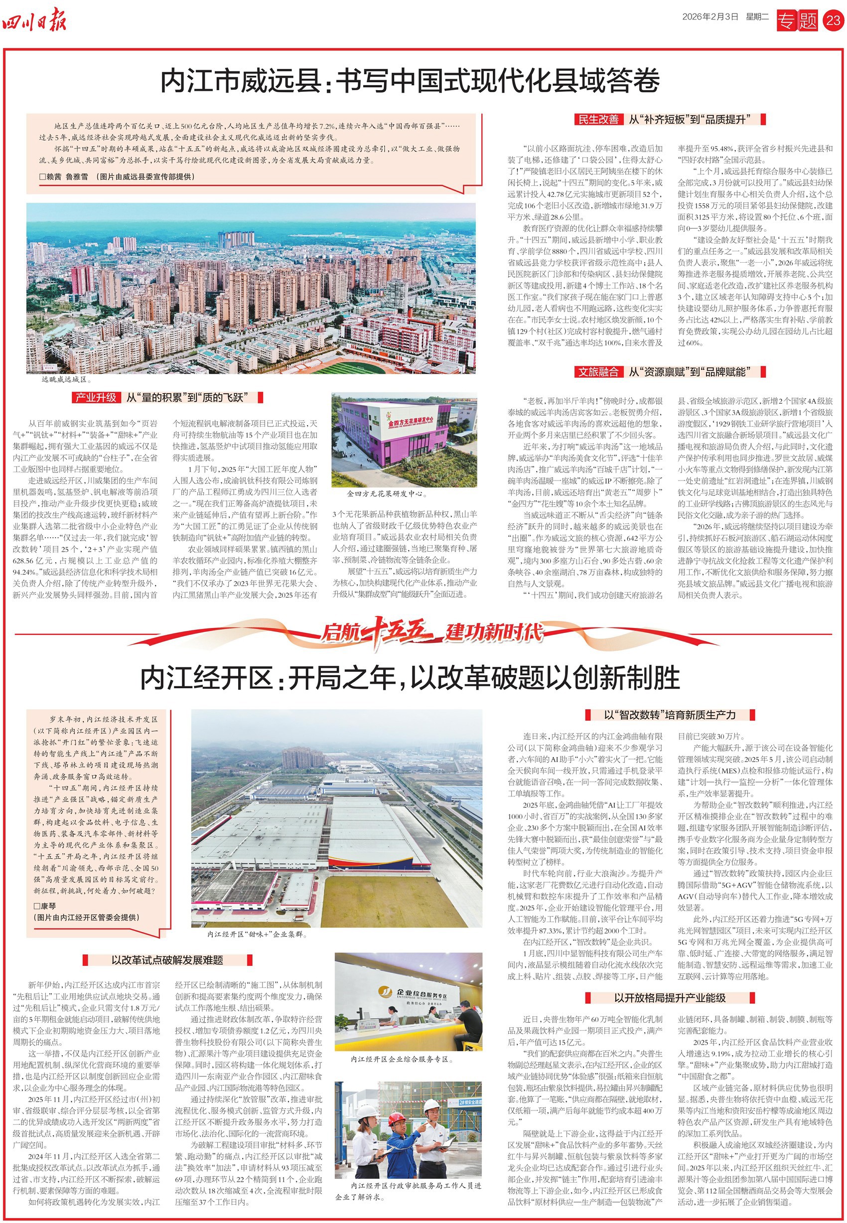 “十四五”期间,内江经开区持续推进“产业强区”战略,锚定新质生产力培育方向,加快培育先进制造业集群,构建起以食品饮料、电子信息、生物医药、装备及汽车零部件、新材料等为主导的现代化产业体系和集聚区。“十五五”开局之年,内江经开区将继续朝着“川渝领先、西部示范、全国50强”高质量发展园区的目标笃定前行。新征程,新挑战,何处着力、如何破题?