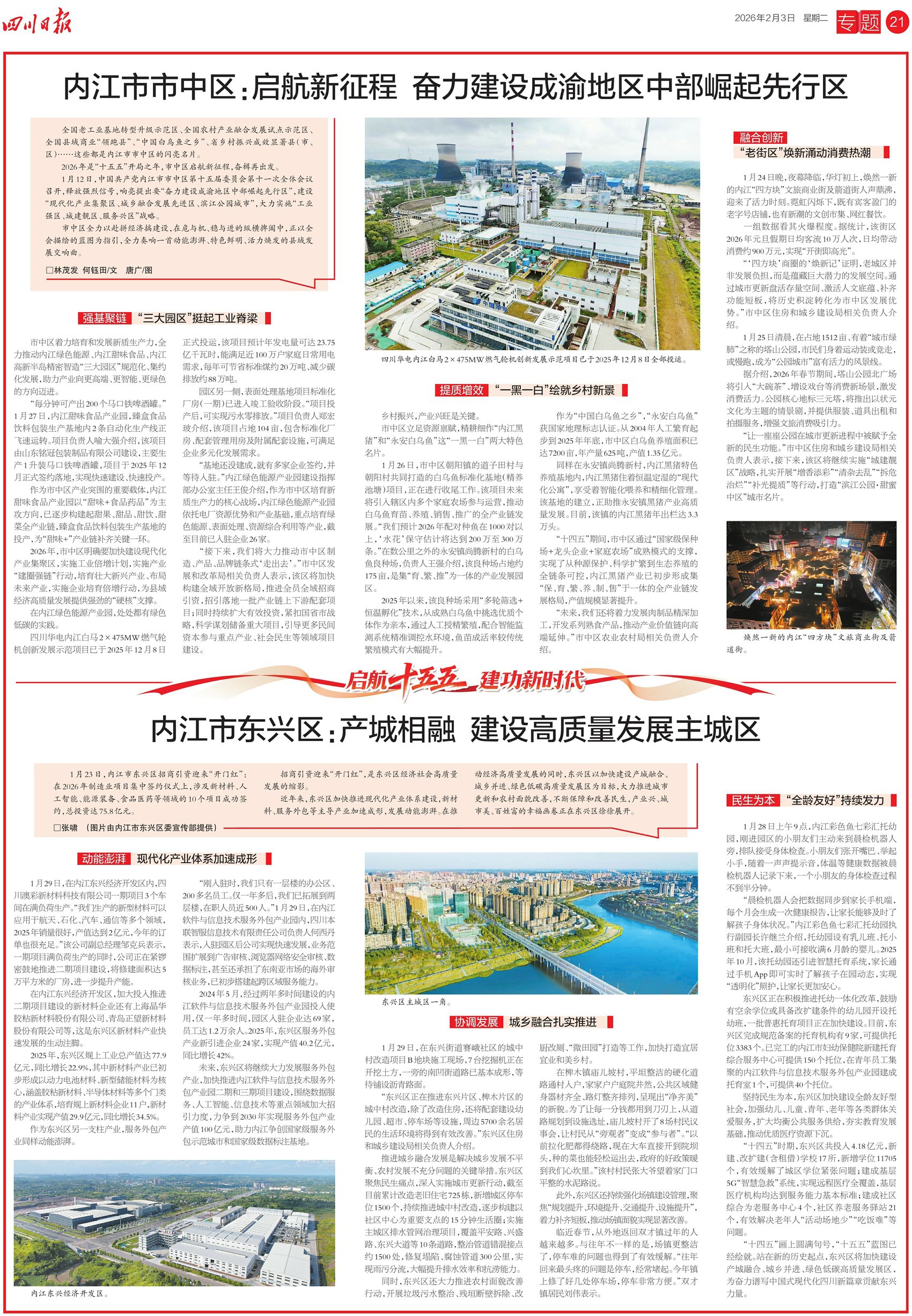 1月29日,在内江东兴经济开发区内,四川澳彩新材料科技有限公司一期项目3个车间在满负荷生产。“我们生产的新型材料可以应用于航天、石化、汽车、通信等多个领域,2025年销量很好,产值达到2亿元,今年的订单也很充足。”该公司副总经理邹克兵表示,一期项目满负荷生产的同时,公司正在紧锣密鼓地推进二期项目建设,将修建面积达5万平方米的厂房,进一步提升产能。