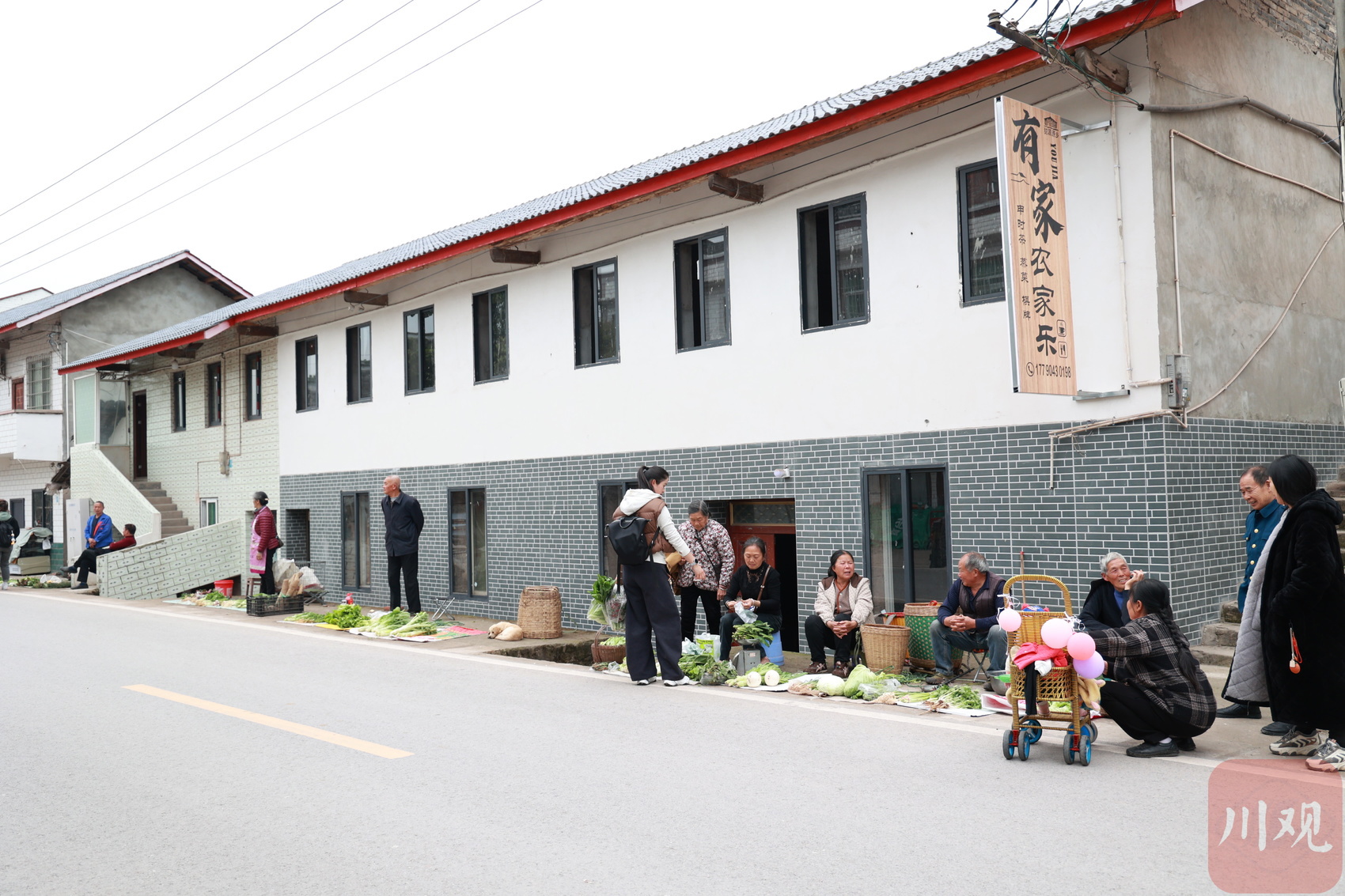 龙门村道路两旁的村民们正在出售自家种植的蔬菜(唐广 摄)